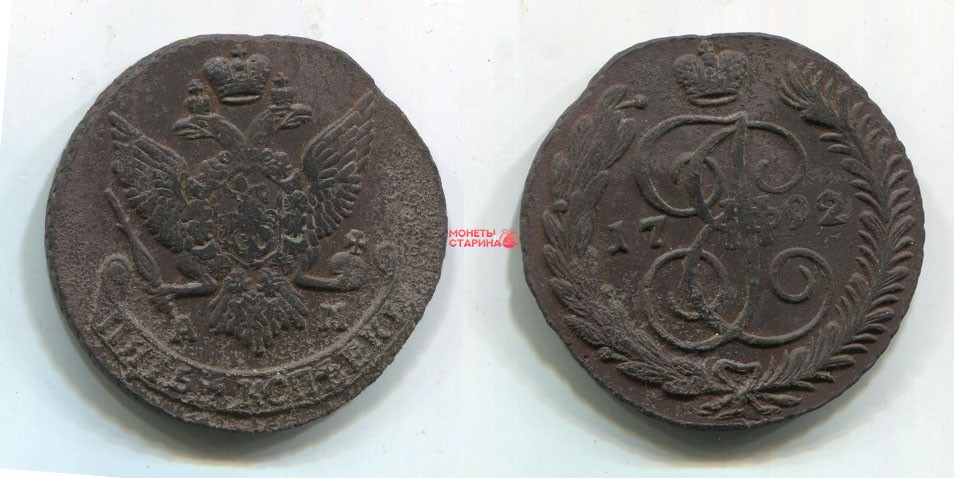 → Монета медная 5 копеек 1792 года (АМ). Императрица Екатерина II
