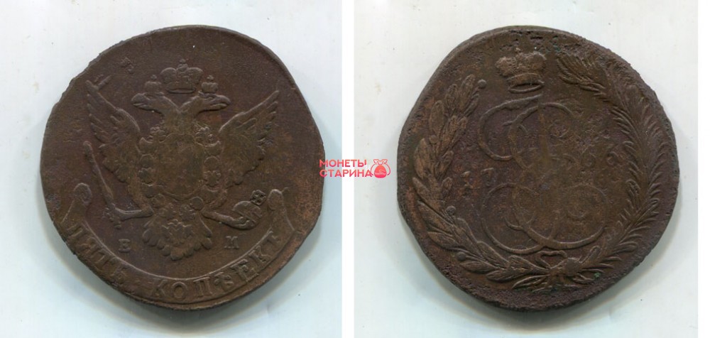 → Монета медная 5 копеек 1766 года (ЕМ). Императрица Екатерина II