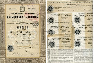→ Акция в 100 рублей 1911 года. Акционерное общество Мальцевских заводов.