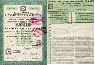→ Акция в 150 рублей 1906 года. Таганрогское металлургическое общество.