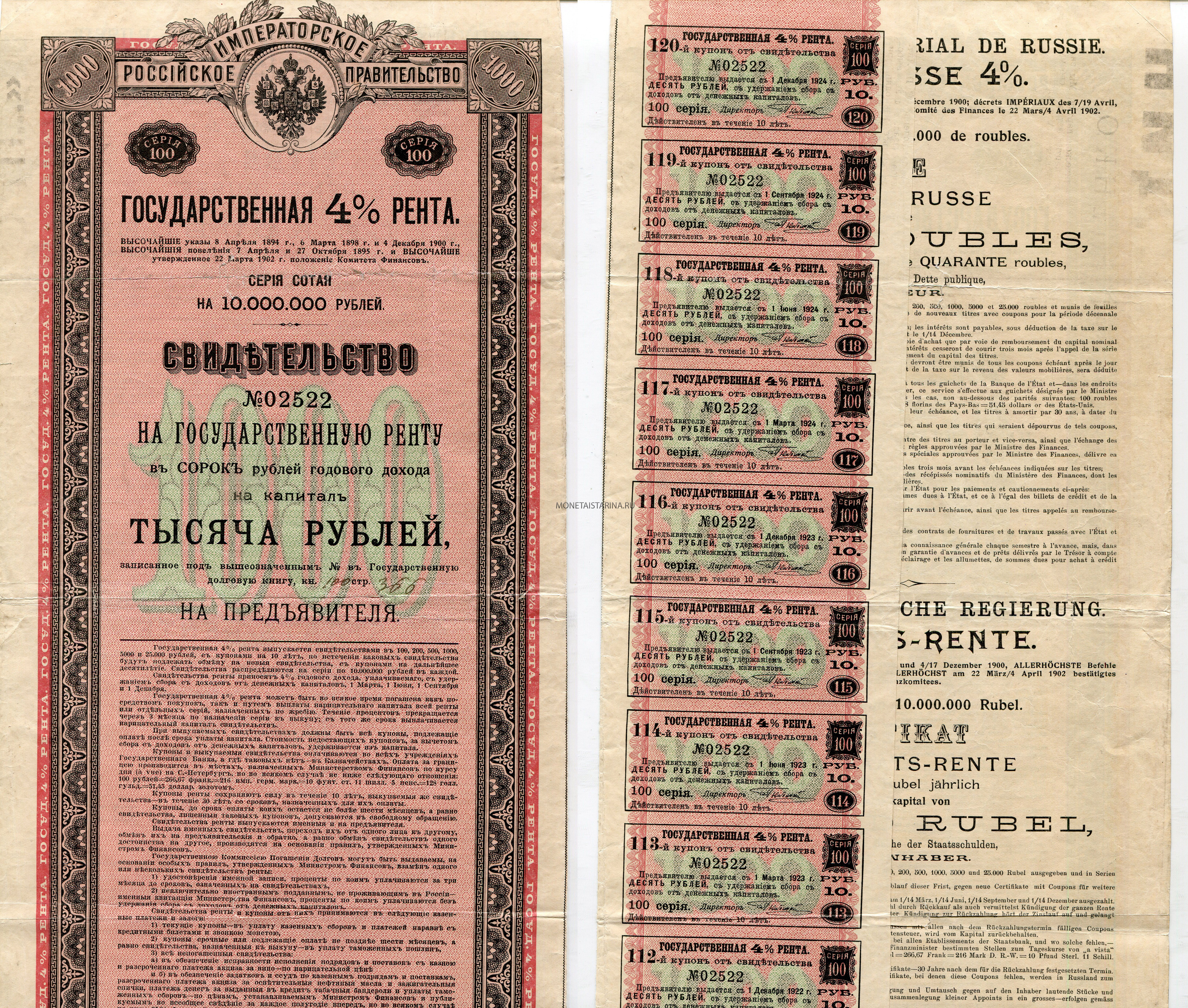 → Государственная 4 % рента 1902 года. Свидетельство на капитал 1000 рублей.