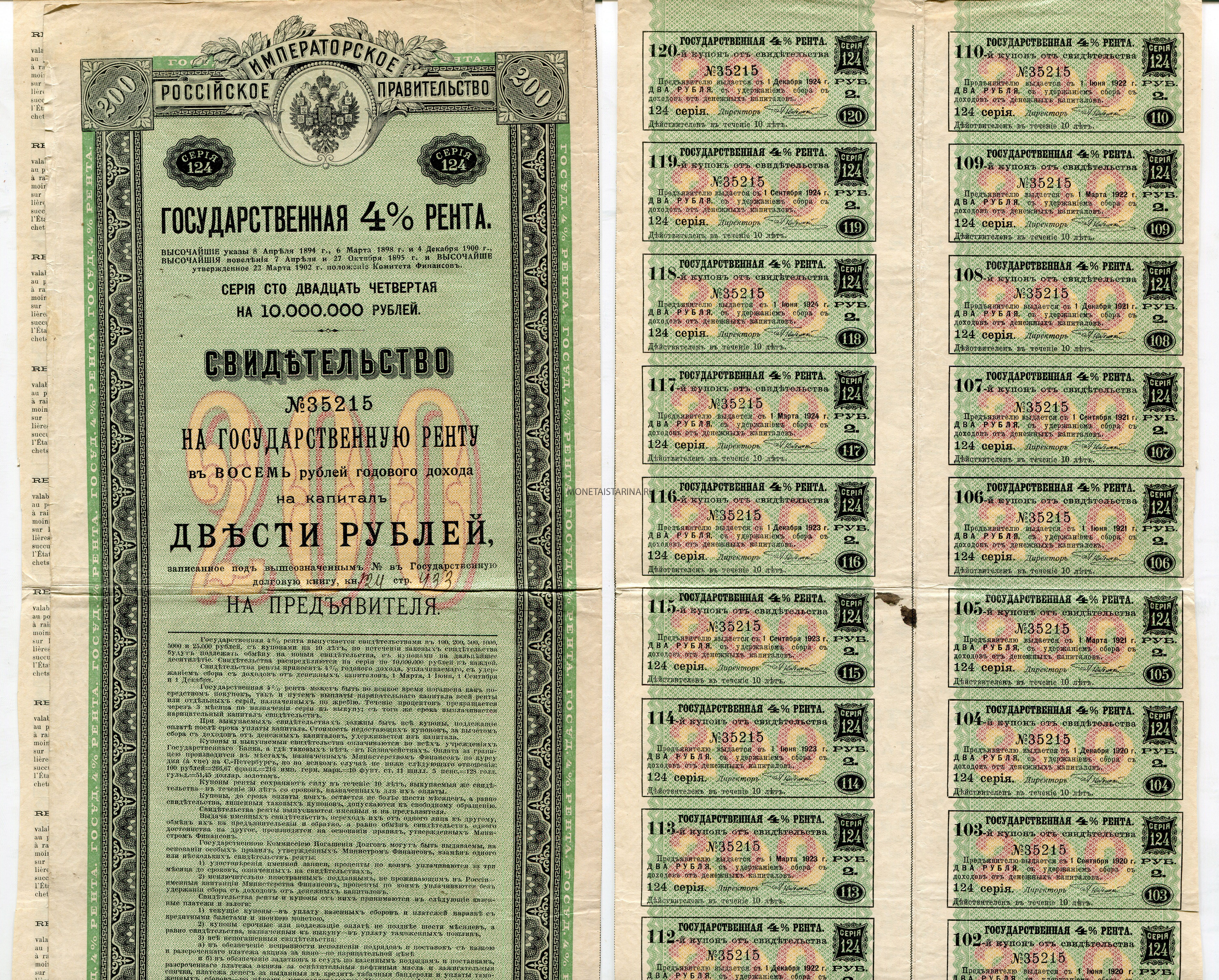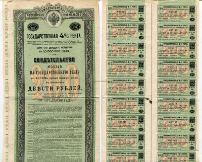 → Государственная 4 % рента 1902 года. Свидетельство на капитал 200 рублей.