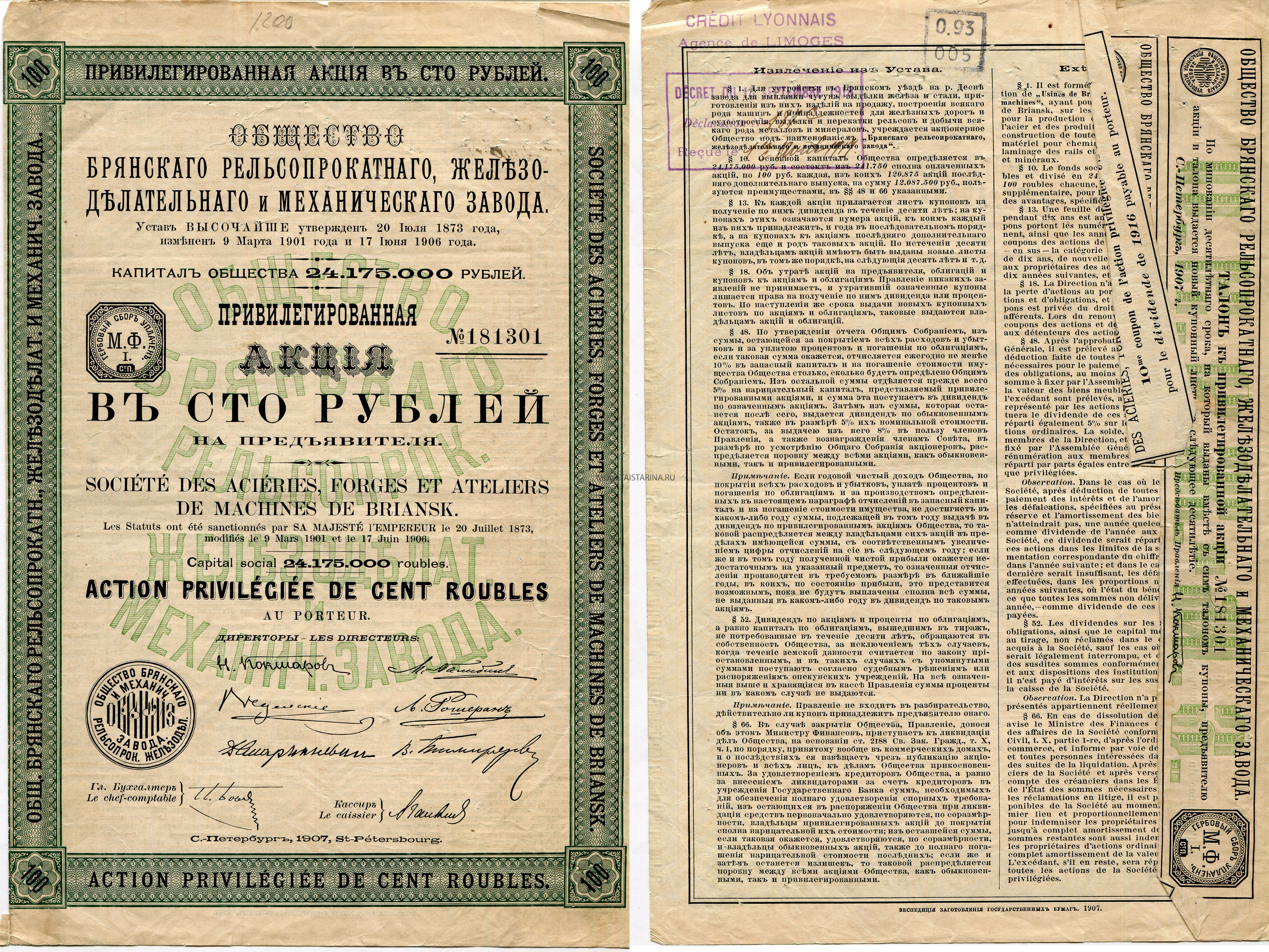 → Привилегированная Акция в 100 рублей 1907 года. Общество брянского рельсопрокатного, железноделательного и механического завода.
