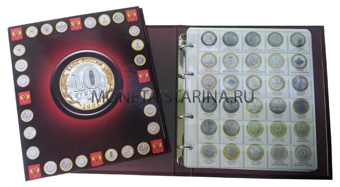 Альбом с кольцевым механизмом для памятных 10-ти рублевых биметаллических , а также юбилейных медно-никелевых монет России достоинством 2, 5, 10 и 1 рубль. В данный альбом входят и листы с изображением гальванических монет серии Города Воинской Славы. Содержит листы с клапаном и листы с изображением монет. Добавились листы с изображением монет, посвященных 200-летию Победы в Отечественной войне 1812 года. Есть возможность установки дополнительных листов. Производитель: Россия. При покупке от 11 штук цена - 350 рублей.
