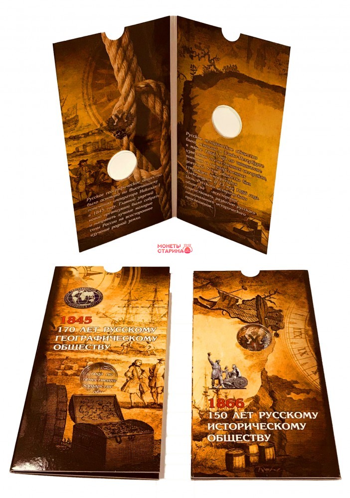Альбом предназначен для хранения монет достоинством 5 рублей, выпущенных в ознаменование 170-летия Русского Географического общества и 150-летия Русского исторического общества. Монеты выпущены в 2015 и 2016 году