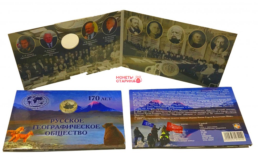Буклет предназначен для хранения монеты достоинством 5 рублей, выпущенной в ознаменование 170-летия Русского Географического общества. Монета выпущена в 2015 году. Имеет блистерную ячейку, что позволяет рассматривать монету, не доставая ее.