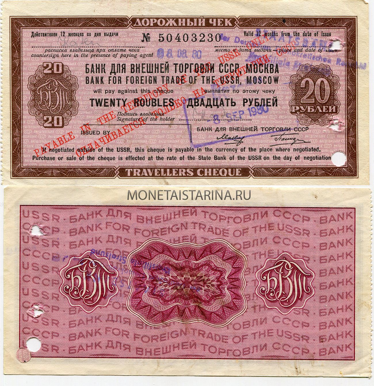 Дорожный чек на сумму 20 рублей 1980 года