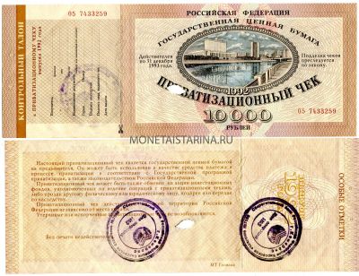 → Приватизационный чек (ваучер) на 10000 рублей 1992 года с контрольным талоном