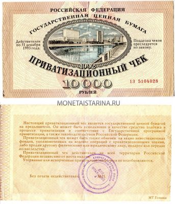 → Приватизационный чек (ваучер) на 10000 рублей 1992 года