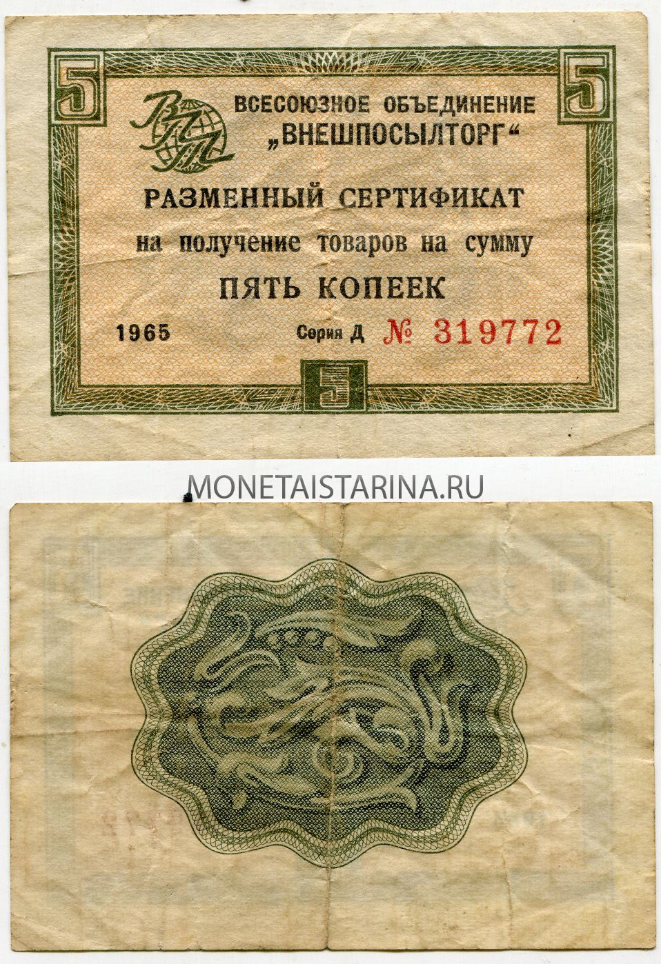 → Разменный сертификат Внешпосылторга на сумму 5 копеек 1965 года