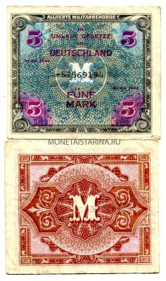 Банкнота 5 марок Союзного военного командования 1944 года Германия (Советская зона оккупации)