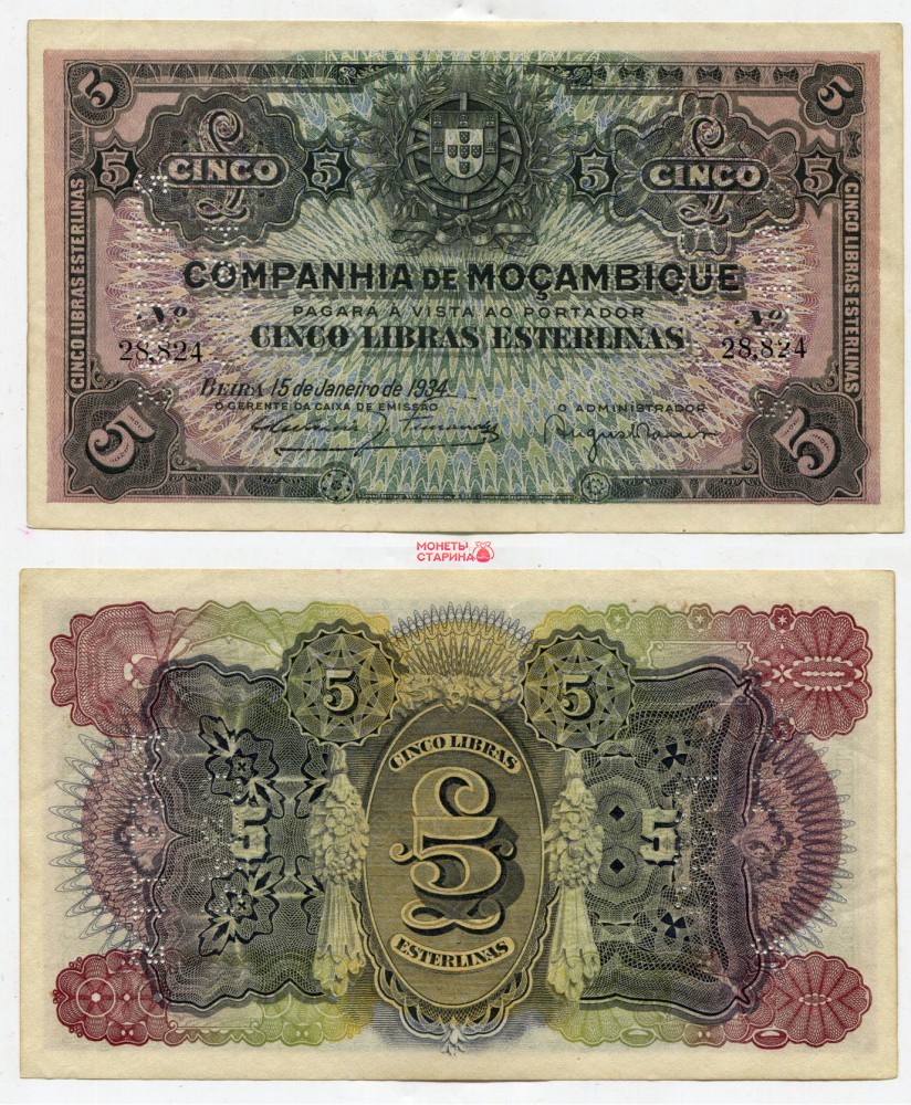 Денежный знак 5 свободных эстерлин Мозамбик, Бейра 1934 год