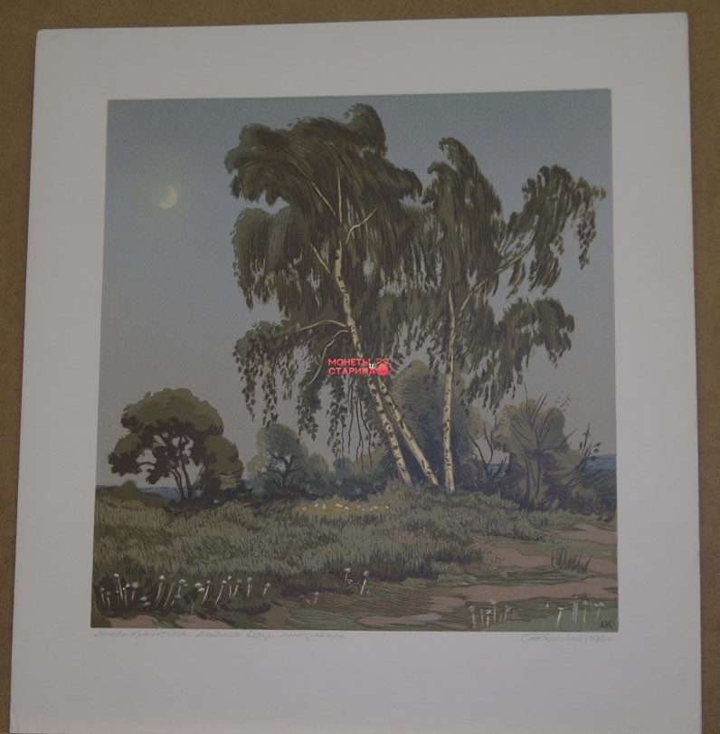 → Цветная линогравюра "Майский вечер" Москва- Крылатское". Художник-график Каримов А.Н. , 1983