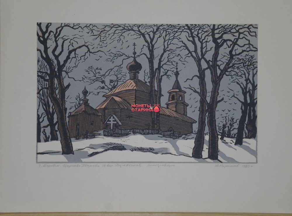 → Линогравюра "Церковь Покрова Боровск". Художник-график Каримов А.Н. , 1985