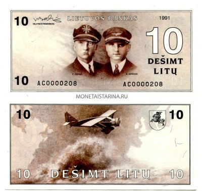 Банкнота 10 лит 1991 года Литва (точка над буквой)