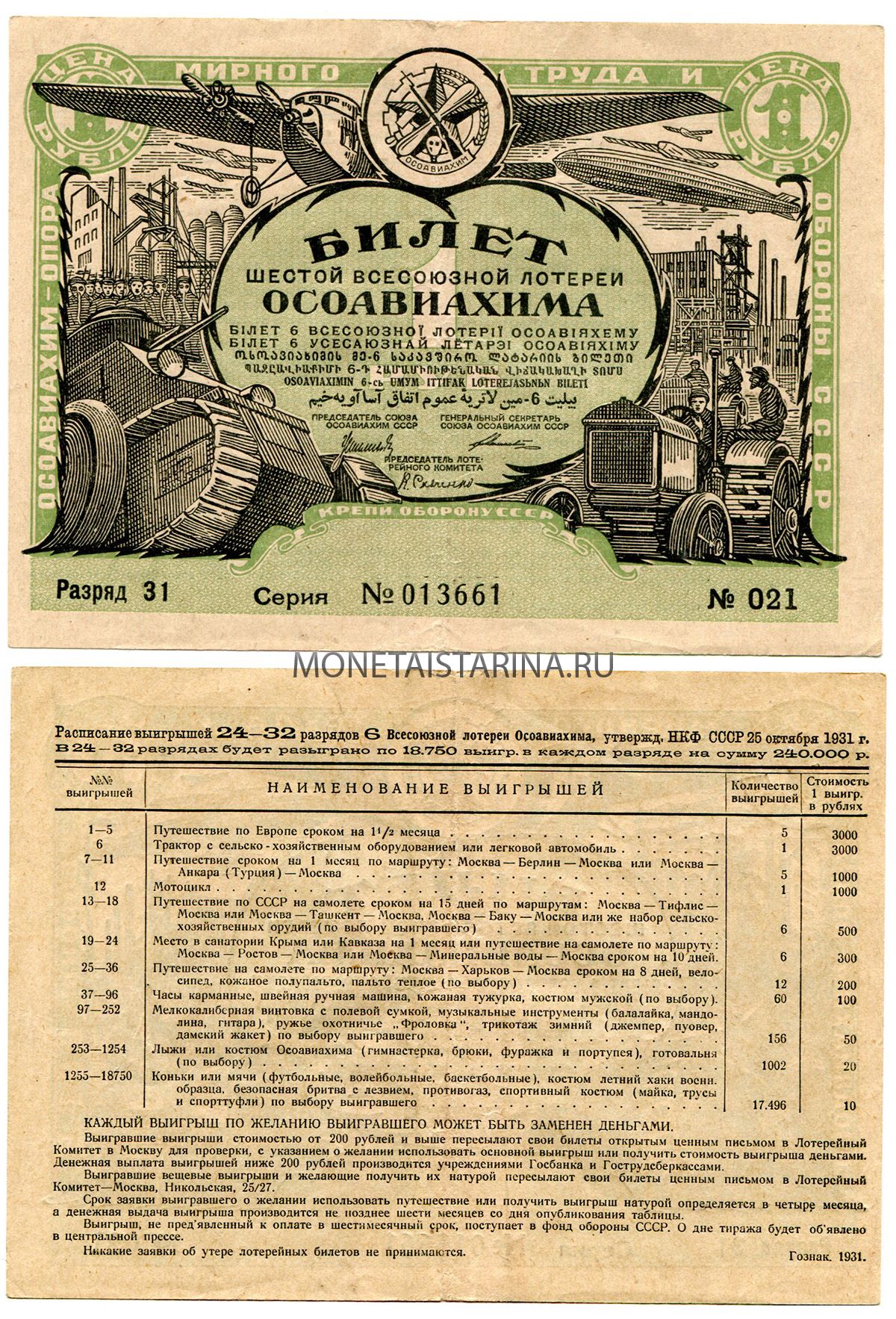 → Билет шестой всесоюзной лотереи ОСОАВИАХИМА 1 рубль 1931 года.
