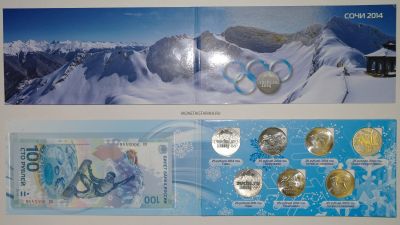 Набор посвящен XXII Зимним Олимпийским играм в Сочи. В комплект входят 7 монет, банкнота и альбом.