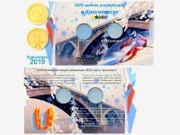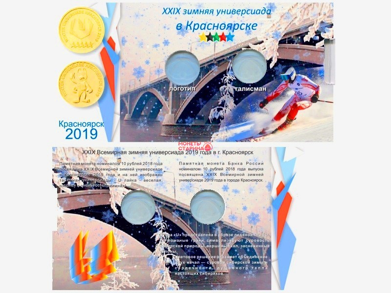 Открытка капсульная "Зимняя Универсиада. Красноярск 2019" для хранения 2-х 10-ти рублевых монет, посвящённых зимней Универсиаде в Красноярске.