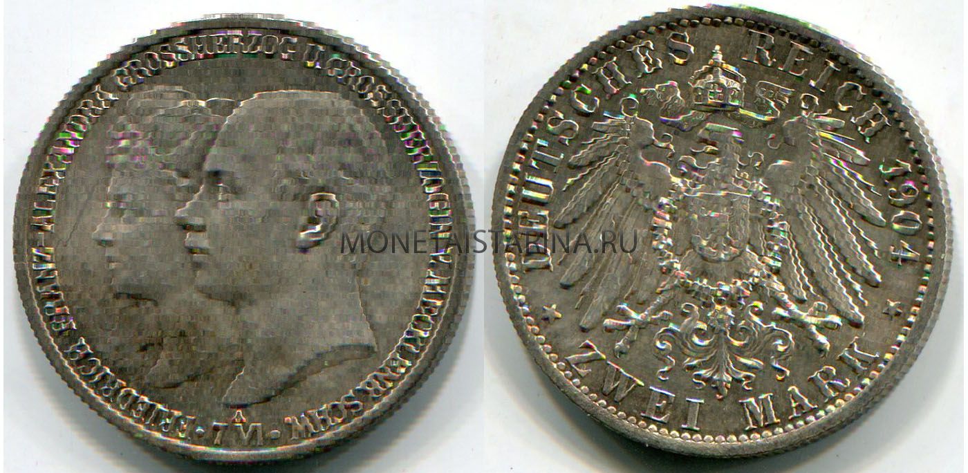 → Монета серебряная 2 марки 1904 года. Германия (Макленбург-Шверин). "Бракосочетание Фридрих Франца IV и Александры"
