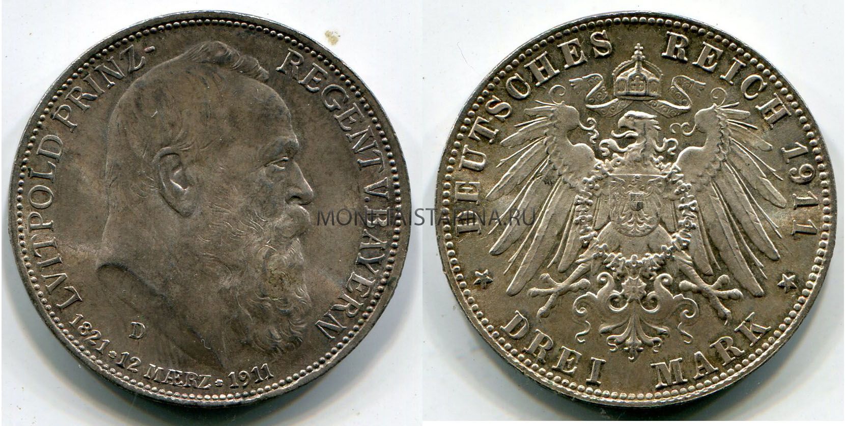 Монета серебряная 3 марки 1911 года. Германия(Бавария). "90-летие Луитпольда Баварского"