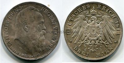 → Монета серебряная 3 марки 1911 года. Германия(Бавария). "90-летие Луитпольда Баварского"
