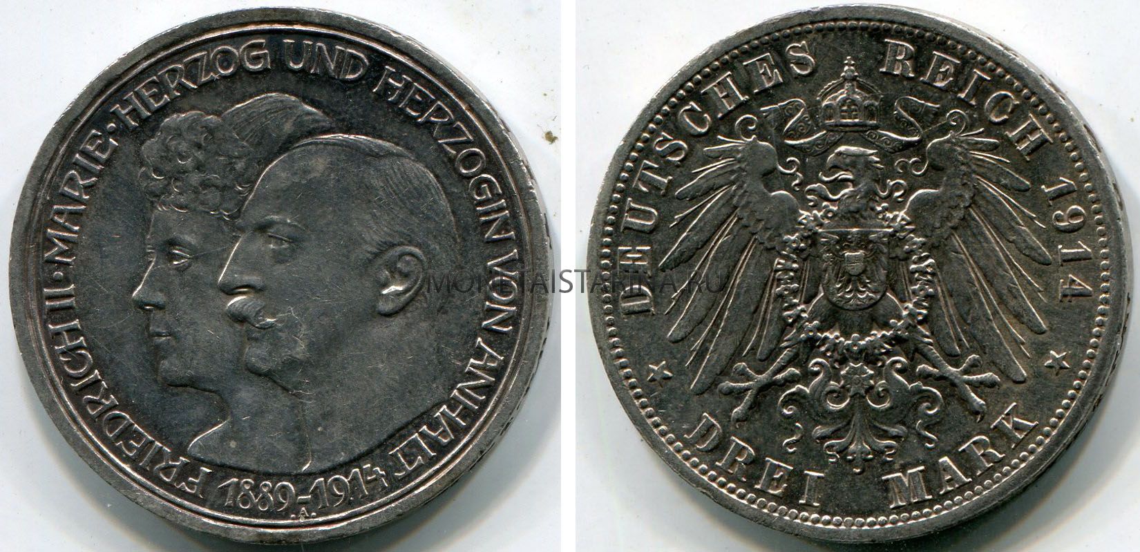 Монета серебряная 3 марки 1914 года. Германия(Анхальт). "Серебряная свадьба Фридриха II и Марии"