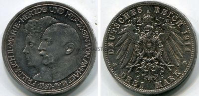 → Монета серебряная 3 марки 1914 года. Германия(Анхальт). "Серебряная свадьба Фридриха II и Марии"