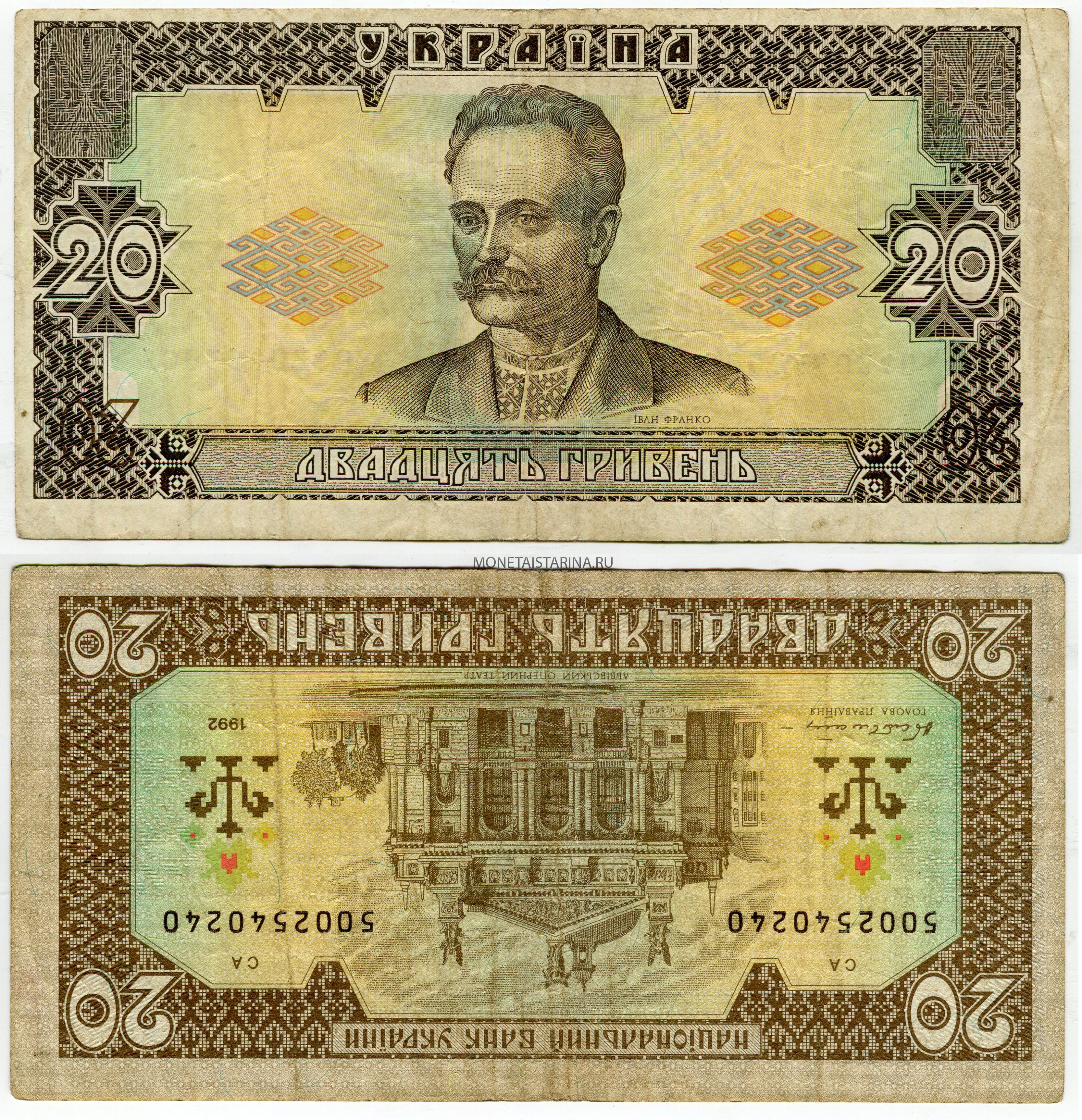 Банкнота 20 гривен 1992 года. Украина.