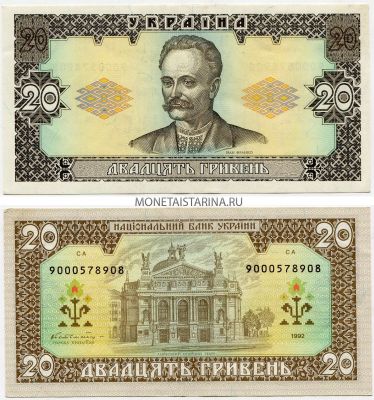 → Банкнота 20 гривен 1992 года. Замещенная серия, в начале номера (9). Украина