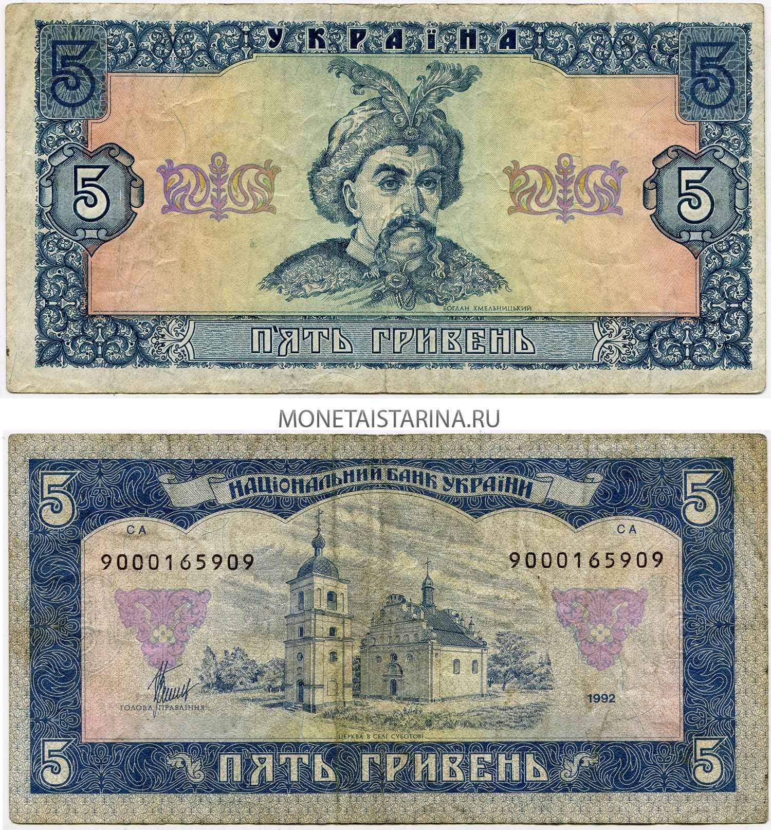 Банкнота 5 гривень 1992 года. Замещенная серия, в начале номера (9). Подпись Матвиенко. Украина.