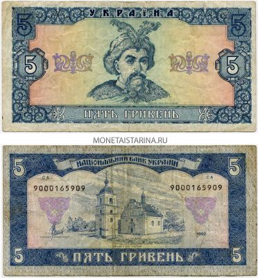 → Банкнота 5 гривень 1992 года. Замещенная серия, в начале номера (9). Подпись Матвиенко. Украина.