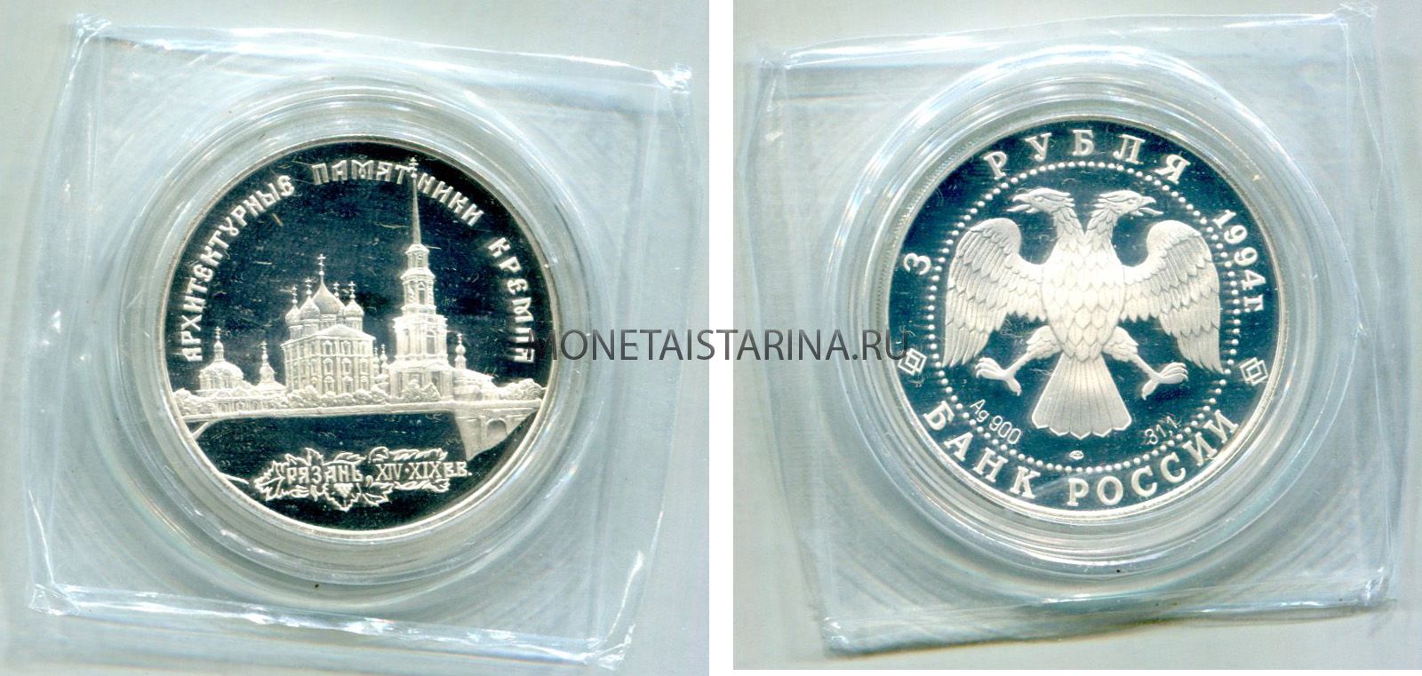 Монета серебряная 3 рубля 1994 года "Рязанский Кремль"