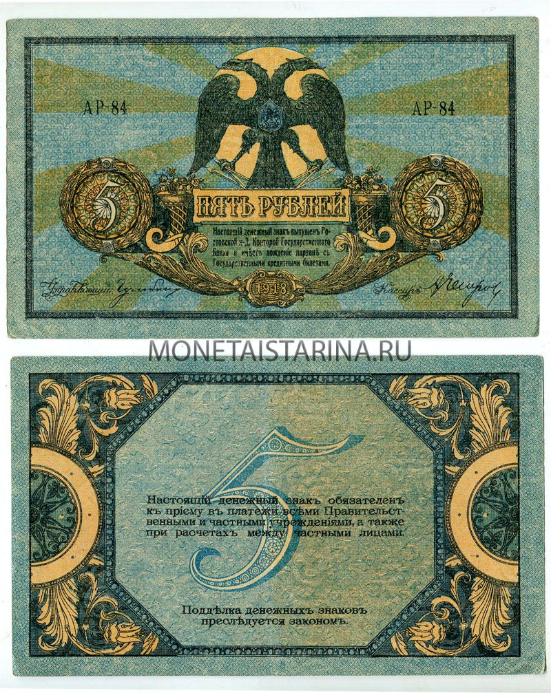 → Банкнота (бона) 5 рублей 1918 года. Ростов на Дону (Юг России)